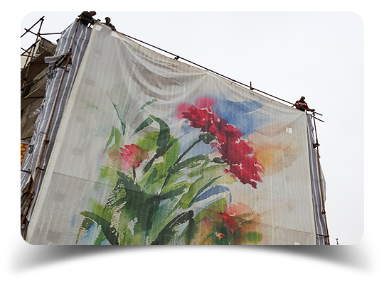 نصب رویه جدید: فلکس جدید توسط تجهیزات ایمنی (مانند بالابر) به محل منتقل شده و با استفاده از ابزارهای کششی و تخصصی (مانند بستهای فلکسی)، به صورت کاملاً صاف، محکم و بدون چین و چروک روی فریم نصب میشود.